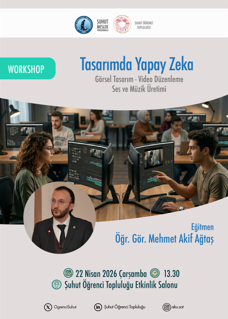 Şuhut Öğrenci Topluluğu tarafından düzenlenen “Tasarımda Yapay Zeka Atölyesi Öğr. Gör. Mehmet Akif Ağtaş eğitmenliğinde gerçekleştirilecektir. Görsel tasarım, video düzenleme, ses ve müzik üretimi konularında kullanılan yapay zeka araçlarının eğitimi verilecektir.